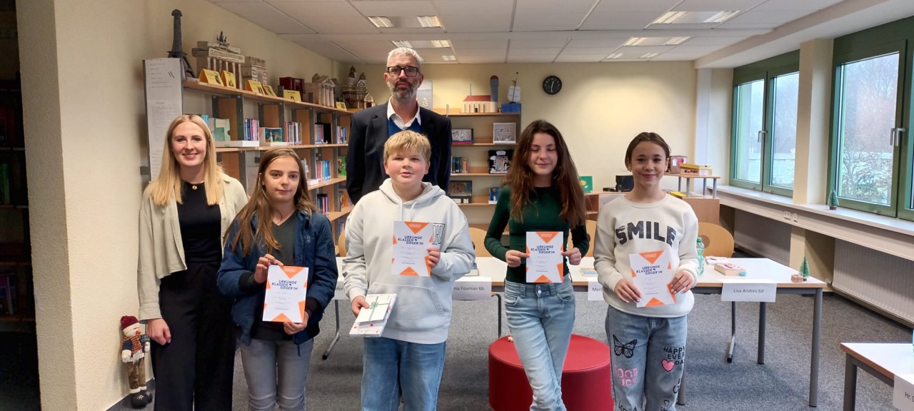 Wie jedes Jahr beim Vorlesewettbewerb wurde unsere Schulbibliothek zu einem ganz besonderen Ort: gemütlich dekoriert, erfüllt von Plätzchenduft und voller gespannter Sechstklässler, die ihre Klassensiegerinnen und -sieger kräftig unterstützten. Unsere Vorleser Ole Kiefer (6a), Sophia Fournier (6b), Merlin Dienemann (6c) und Lisa Andres (6d) eröffneten den Wettbewerb mit ihren selbstgewählten Texten. Es war ein Vergnügen zuzuhören und im Stress der Vorweihnachtszeit ein wunderbarer Moment des Abtauchens in andere Welten.